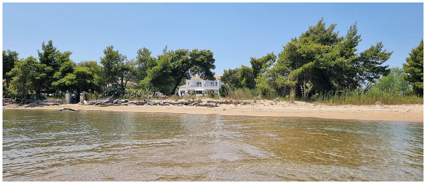 Just imagine stepping out of your villa, wandering down the garden path, straight onto your own stretch of soft sandy beach. The sea is calm and shallow - perfect for a morning swim - while upstairs, the veranda offers a front-row seat to unforgettable sunrises over the Ionian.